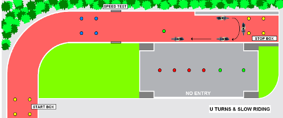 You need to be able to ride your motorcycle around in a U turn under control by coordinating the use of the throttle, clutch, gears, rear brake and steering. Take proper observation before commencing and during the exercise, you must check the blind spots. Take observation as you would if you were on the public road. You must show that you can manoeuvre the bike in a restricted space by riding between marked lines, kerbs or cones without touching them, whilst maintaining your balance. Keep your feet on the footrests.